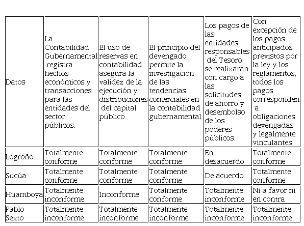 Tras la aplicación de la encuesta realizada a los representantes de las áreas de contabilidad, presupuestos y sistemas de información y comunicación, se puede deducir que, de manera general, los cantones: Sucúa, Logroño y Pablo Sexto coinciden en que la contabilidad gubernamental es una herramienta muy importante para la obtención de correctos registros económicos y contables, siempre y cuando los mismos estén amparados por las distintas normativas en curso.