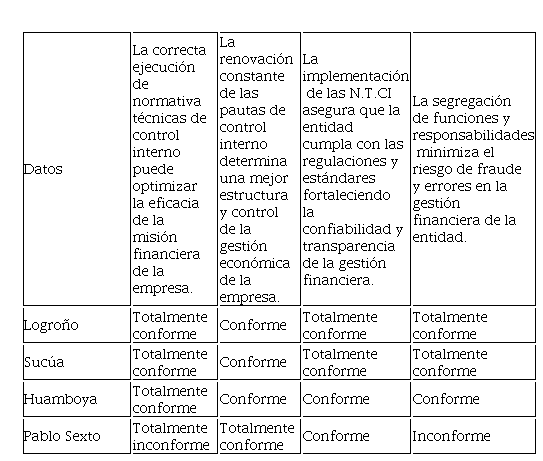 En la tabla No. 3 se analizó el componente Control Interno, para lo cual se estudiaron temas relacionados a las normativas técnicas y su eficiencia en la misión financiera de la empresa, donde el 75% (Sucúa, Huamboya y Logroño) están conformes y un 25% no, siendo el caso de Pablo Sexto, en el caso de la renovación de las pautas de control interno para la mejora del control económico de la empresa, el 75% (Logroño, Sucúa y Huamboya) están conformes, mientras que el 25% (Pablo Sexto) está totalmente conforme, en la misma línea en la pregunta relacionada con la implementación de Normas de control Interno para asegurar el cumplimiento de la gestión financiera y su transparencia, el 50% (Logroño y Sucúa) están totalmente de acuerdo, y el 50% restante se siente conforme, por último, en cuanto a la segregación de funciones para mitigar errores y fraudes, el 50% (Logroño y Sucúa) afirmó estar de acuerdo, mientras que el 25% (Huamboya) se siente conforme, y el 25% restante (Pablo Sexto) se muestra inconforme.