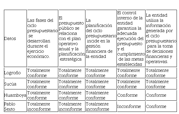 (Pablo Sexto) inconforme. En cuanto al control Interno como garantía de una adecuada ejecución del presupuesto el 50% (Logroño y Sucúa) se muestra de acuerdo, mientras que el 25% (Huamboya) se siente conforme y el 25% restante (Pablo Sexto) expresa su inconformidad. Por último, en relación a si la entidad utiliza la información generada por el ciclo presupuestario para la toma de decisiones, el 50% se muestra totalmente conforme, mientras que el otro 50% se muestra conforme.