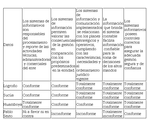 En la tabla No. 5 se estudió el componente Sistemas de información y comunicación, donde se abordaron temas relacionados con el procesamiento de reportes de actividades como responsabilidad del área de sistemas informativos, en donde el 50% (Logroño y Sucúa) están conforme, mientras que el 25% (Huamboya) se muestra conforme y el 25% restante, mantiene una postura indiferente, siento esta la de Pablo Sexto, en cuanto a, si los sistemas de informacion permiten valorar consecuencias de la gestion y compararla con los propósitos de la entidad, el 75% se mostró conforme, mientras que el 25% restante afirmó estar inconforme, siendo este último el cantón Pablo Sexto. En el mismo contexto sobre la pregunta referente a si los sistemas de información se relacionan con el plan estratégico, Sucúa y Logroño (50%) se muestran totalmente conformes, mientras que Huamboya (25%) expresa estar conforme y Pablo sexto (25%) afirma no estar conforme, además en la pregunta acerca de si la información que brinda el sistema contable contribuye a la toma de decisiones, el 75% mostró estar totalmente conforme, mientras que el 25% mencionó estar totalmente inconforme, siendo este el cantón Pablo Sexto. Por último, en cuanto a los controles que poseen los sistemas informativos para asegurar una adecuada gestión, el 75% expresó estar totalmente conforme, y el 25% restante mostró estar conforme.