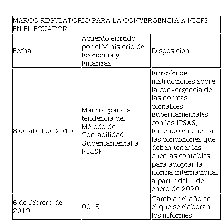 El Ministerio de Finanzas del Ecuador (2010) dio paso a la creación del Código Orgánico de Organización y Finanzas Estatales en el cual el Ecuador acoja las normas internacionales en el área pública no financiera, en el cual se establece lo siguiente: