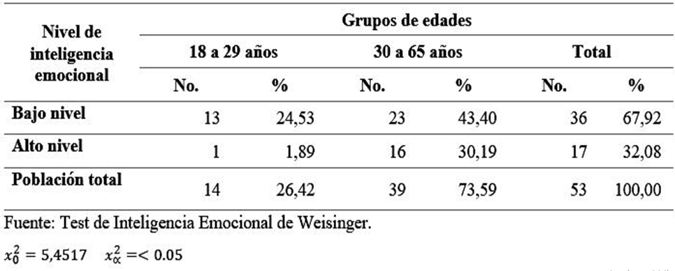 El análisis de los resultados del Test de Inteligencia Emocional en la población estudiada arrojó un predominio del grupo de edades de 30 a 65 años (73,59 %); así como del bajo nivel de IE, para un 67,92 % (sobre todo en pacientes con edades entre 18 y 29 años) (tabla 1). La aplicación de la prueba de Chi Cuadrado posibilitó determinar que entre esas dos variables existe una dependencia significativa.