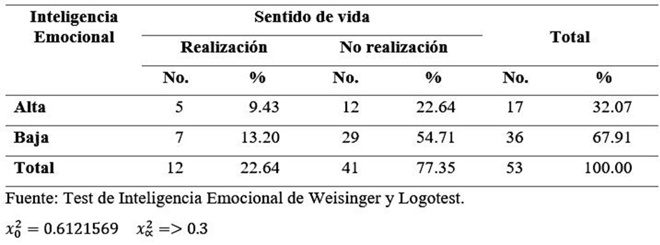 La independencia de las variables inteligencia emocional y sentido de vida quedó establecida a través de la prueba estadística Chi Cuadrado (tabla 3).