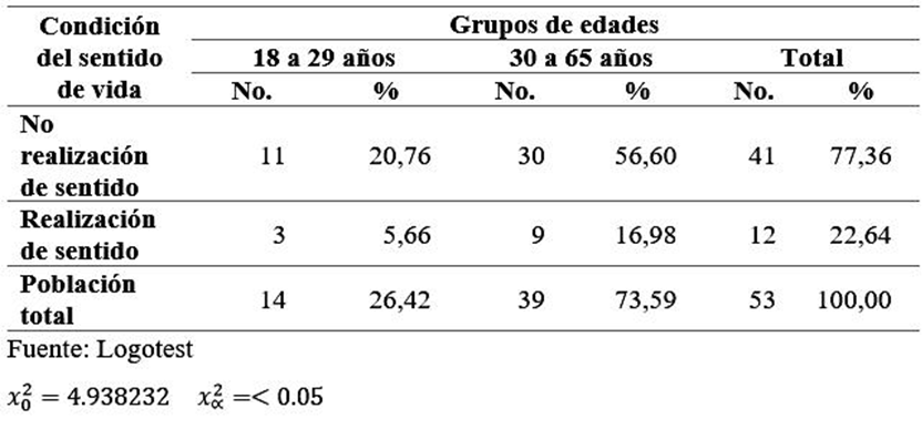 La categoría de no realización de sentido de vida preponderó entre los pacientes a los que se aplicó el Logotest (77,36 %). Mediante la prueba Chi Cuadrado se comprobó dependencia entre las variables. (tabla 2).