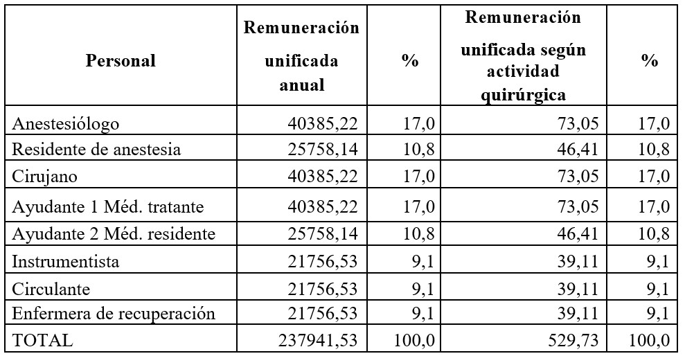 El equipo quirúrgico, que realizó las prestaciones de colecistectomía laparoscópica en el Hospital Provincial Riobamba durante el 2014, recibió $237 941,53 dólares americanos (USD) (tabla 1) por concepto de salario. En ese rubro, los médicos tratantes resultaron los mejores remunerados, tal como corresponde según los estamentos legales regulados mediante la Ley Orgánica de Salud y otras normativas complementarias.(11)