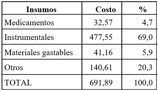 El instrumental utilizado durante la intervención quirúrgica en cuestión resultó el insumo más costoso, con un valor por prestación de $477,55 USD (tabla 2); de los cuales $440,00 USD corresponden al uso de trocar, ya que son descartables, se requieren cuatro por cada operación y tienen un valor unitario de $220,00 el par.