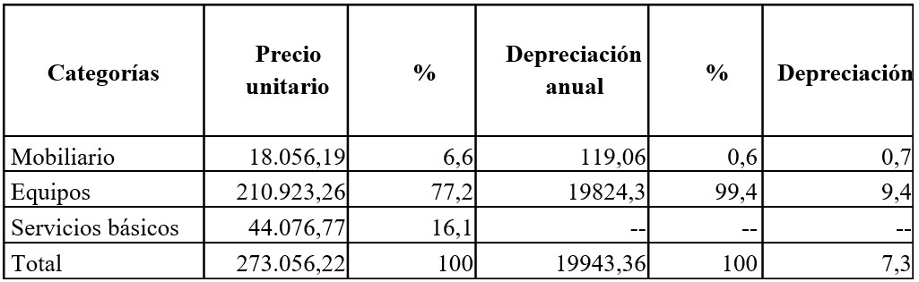 El valor del equipamiento que se requiere para la prestación de salud en cuestión resulta el más elevado dentro del rubro de activos fijos tangibles. En el caso del HPGDR, este se cotizó en $210 923.26 USD (tabla 3), cuya tasa de depreciación anual tiene un valor importante.