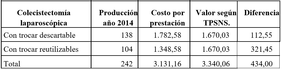 El valor asignado a la intervención quirúrgica por colecistectomías laparoscópicas en el Tarifario de Prestaciones para el Sistema Nacional de Salud resultó menor al real observado en la investigación que se presenta, si el procedimiento se realiza empleando trocar descartable; sin embargo, al ocupar ese dispositivo reutilizable el valor bajó del establecido en el documento normativo mencionado.