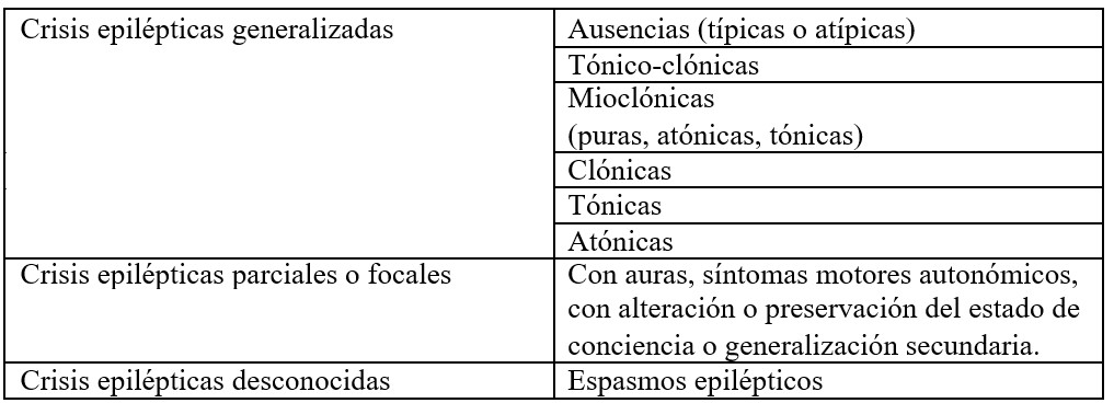 1. Crisis desconocidas: en este apartado se incluyen los espasmos epilépticos y otras variedades de crisis epilépticas que no entran en las categorías anteriores. Esta tipificación de crisis desconocidas es un nuevo aporte de la clasificación de la ILEA publicada en 2010.(1)