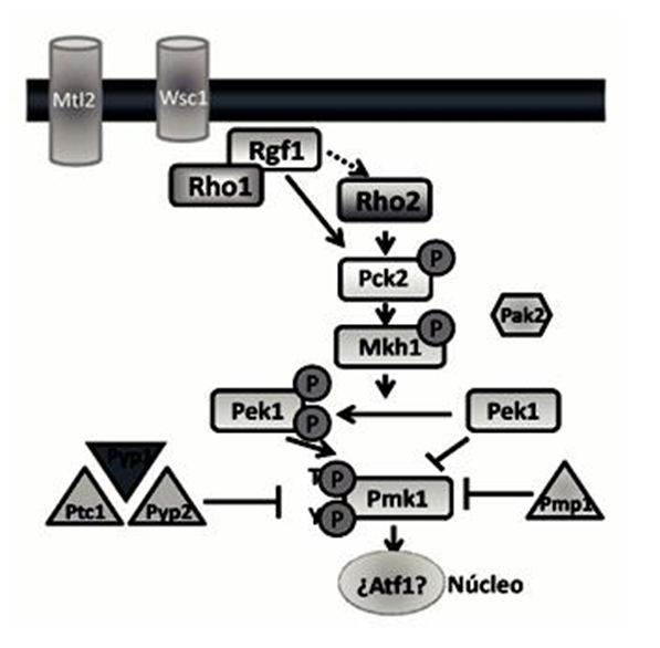 La cascada de señalización de mantenimiento de la integridad celular en S. pombe está constituida por tres kinasas Mkh1p, Pek1p/Shk1p y Pmk1p/Spm1p (Figura 1). (13,14,15,16,17,18) (Figura 1).