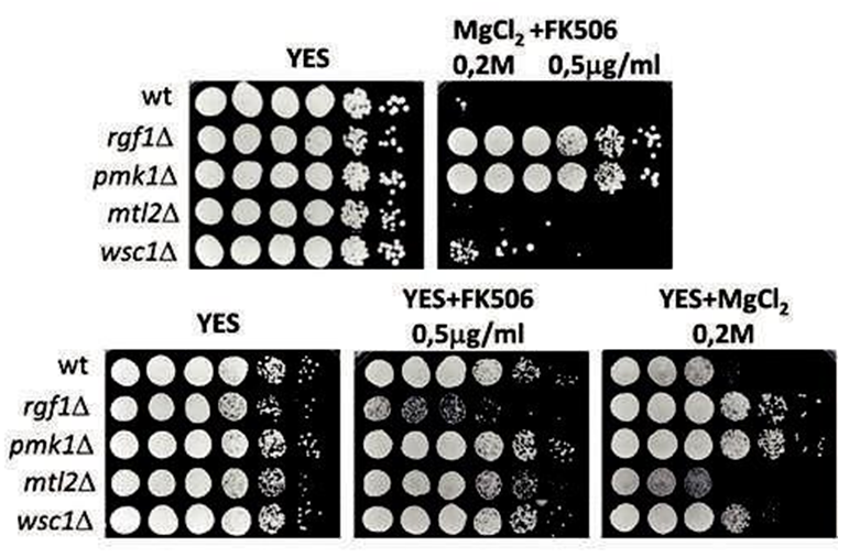Células silvestres rgf1∆, pmk1∆, mtl2∆ y wsc1∆ fueron sembradas en placas de YES y de YES + FK506 (0,5 mg/ml) + MgCl2 (0,2M) (paneles superiores). Se realizaron diluciones seriadas (con 8x104, 4x104, 2x104, 2x103, 2x102 y 2x101 cels/ml) y se sembraron aproximadamente 3ml de cada una de estas diluciones. Las mismas cepas fueron sembradas en placas de YES + FK506 (0,5 mg/ml) y YES + MgCl2 (0,2M) por separado (paneles inferiores). Las placas fueron incubadas a 28ºC durante 3 días.