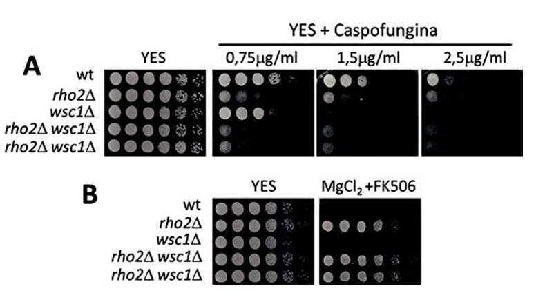 Ensayo de sensibilidad a caspofungina de la cepa silvestre, los mutantes rho2∆, wsc1∆ y los dobles mutantes rho2∆wsc1∆. Se hicieron diluciones seriadas de cada cepa (8x104, 4x104, 2x104, 2x103, 2x102 y 2x101 cels/ml) y se sembraron aproximadamente 3ml de cada dilución en placas de medio rico (YES) y YES suplementado con caspofungina (0,75mg/m, 1,5 mg/ml y 2,5mg/m). B- Las mismas cepas se sembraron en placas de YES y de YES + FK506 (0,5 mg/ml) + MgCl2 (0,2M). Las placas se incubaron 3 días a 28oC.