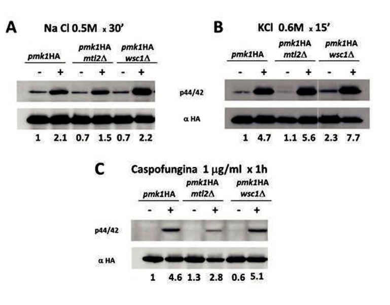 No se observó diferencias significativas en la fosforilación de Pmk1p entre las células silvestres y los mutantes nulos mtl2∆y wsc1∆ (Figura 4). No se apreciaron cambios ni en la actividad basal, ni cuando las células se sometieron a estrés osmótico con KCl o NaCl. Pero quizás el dato más concluyente de los mencionados hasta ahora es que la activación de Pmk1p que se produce en respuesta a estrés osmótico o a estrés producido por daños en la pared, no depende de Mtl2p ni de Wsc1p. No observamos diferencias significativas en la fosforilación de Pmk1p entre las células silvestres y los mutantes nulos mtl2∆ y wsc1∆, ni cuando las células se someten a estrés osmótico (con KCl o NaCl), ni en presencia de Caspofungina. Tampoco observamos diferencias entre los mutantes mtl2∆y wsc1∆ la cepa silvestre, analizado otros tipos de estrés, como estrés oxidativo, heatshock o ayuno de glucosa.
