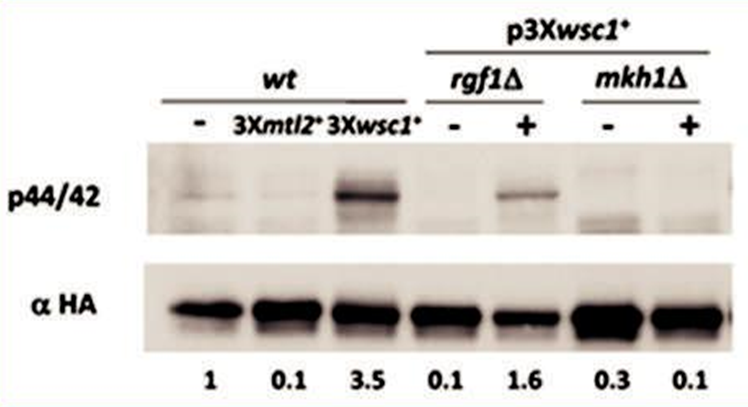 Sin embargo, se observó que la sobreexpresión de wsc1+ aumenta claramente los niveles de fosforilación de Pmk1p (Figura 5), comparado con la cepa que sobreexpresa mtl2+ o con la cepa que lleva el plásmido vacío. Este aumento depende del módulo de MAP kinasas ya que no se produce en el mutante mhk1∆ y depende solo parcialmente de Rgf1p. La sobreexpresión de Wsc1p aumenta los niveles de Rho1p y también aumenta la cantidad de pared celular, lo que es un estrés para la célula y podría actuar activando la cascada indirectamente. Aun así y puesto que los “sensores” comparten una función esencial en lo que respecta a la integridad celular, podríamos pensar que solo la ausencia de los dos a la vez debería tener un efecto en la transmisión de la señal.