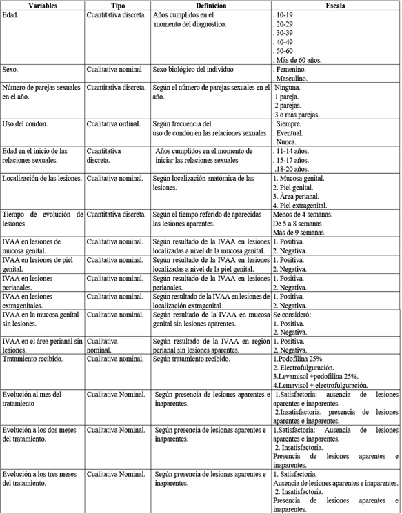 La ubicación de las lesiones prevaleció en el área de la mucosa genital y la evolución de estas entre cinco y ocho semanas. La inspección visual con ácido acético permitió establecer positividad en la totalidad de lesiones localizadas en mucosa genital; no así, en áreas extragenitales y en la región perianal sin lesiones aparentes.