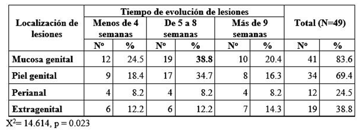 La mayoría de las lesiones observadas tuvieron entre 5 y 8 semanas de evolución, así como las que se localizaron en la mucosa genital (83.7%); seguido por aquellas en la piel genital con el 69.4% (tabla 2). Entre ambas variables se estableció una relación significativa (p = 0.023).