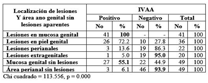 Los resultados de la IVAA permitieron establecer positividad en el 100% de las lesiones localizadas en mucosa genital; sin embargo, resultó negativa en la mayoría de las lesiones de localización extragenital, para un 95%. En el caso de la exploración con esa técnica a nivel de la mucosa genital sin daños aparentes, se observó un predominio de reportes positivos (55.1%), contrariamente a lo visto en el área perianal, con el 93.9% de informes negativos.