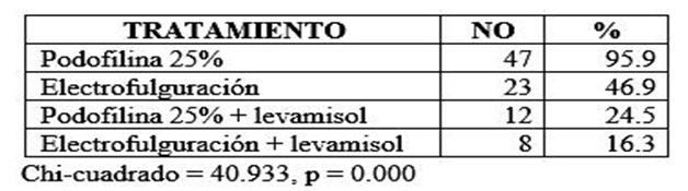 En relación con el tratamiento empleado en los pacientes estudiados, se encontró un predominio en el tratamiento tópico con podofilina al 25%, representando el 95.9%; mientras que el menos utilizado correspondió a la electrofulguración combinada con el levamisol en tableta (16.3%). Al respecto se determinó una diferencia muy significativa en el comportamiento de esa variable mediante la prueba Chi-cuadrado (p= 0.000) (tabla 4).