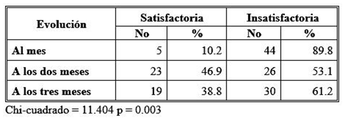 Respecto a la evolución después del tratamiento en los pacientes estudiados, la mayoría de los pacientes evolucionó insatisfactoriamente, observándose los peores resultados luego del primer mes (89.8%).