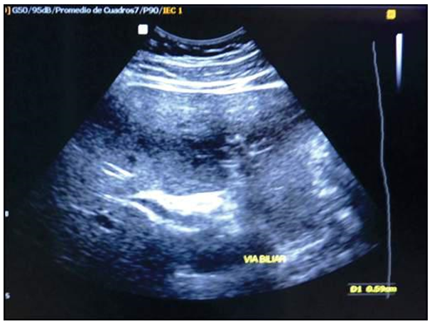 Hígado de morfología normal, tamaño, ecoestructura normal. Vesícula biliar distendida, sin imágenes litiásicas en su interior. Vías biliares intra y extra hepáticas sin signos de dilatación.
