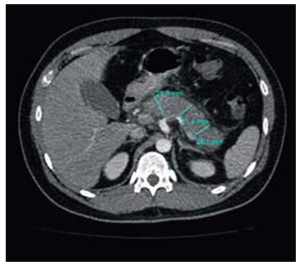 Páncreas con bordes discretamente irregulares, con incremento de tamaño a nivel de cabeza cuerpo y cola; infiltración de grasa peri pancreática (Baltazar C)