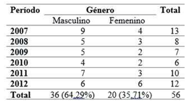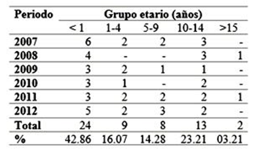Los datos acerca de la edad de los pacientes de la población estudiada posibilitaron observar que la mayoría de los casos se produjeron en niños menores de 1 año, para el 42,86% (tabla 2).