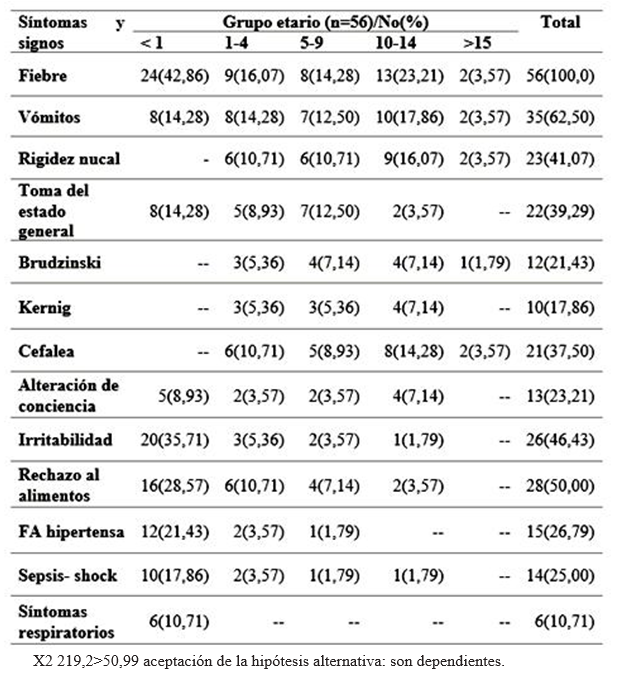En relación con los síntomas y signos observados al momento del diagnóstico, la totalidad de los casos incluidos en el estudio presentaron fiebre y 35 (62,5%) de ellos tuvieron vómitos (tabla 3). La prueba estadística Chi cuadrado permitió establecer la dependencia entre esa variable y el grupo etario.