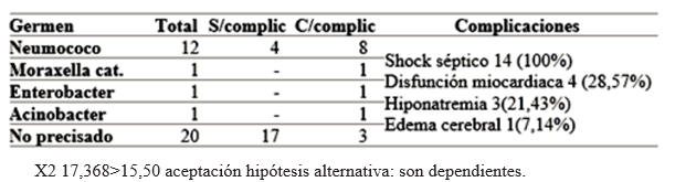 De un total de 56 pacientes, 42 (75,00%) cursaron la enfermedad sin alguna complicación, mientras que un 14 (25,00%) si presentaron, los que además desarrollaron shock séptico y 8 de ellos padecieron de meningoencefalitis neumococcica. El fallecimiento de 8 pacientes resultó la consecuencia más grave dentro del contexto estudiado (tabla 4). Estas dos variables resultaron dependientes, atendiendo a los resultados obtenidos en la prueba de Chi cuadrado realizada.