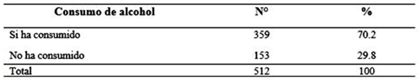 El análisis del consumo de alcohol en los estudiantes de las tres facultades estudiadas en el contexto de la Universidad Nacional de Chimborazo (Ingeniería, Ciencias de la Salud y Cien-cias Políticas), arrojó altos índices relacionados con esta problemática; el 70.2% (tabla 1) de la población estudiada manifestó haber ingerido algún tipo de bebida etílica por lo menos una vez en su vida (tabla 1).