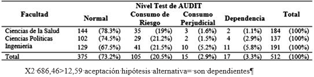El nivel de consumo de alcohol se establece a partir de la cantidad y frecuencia con la que este se realiza por parte de los individuos. Al respecto, resulta importante destacar que la mayoría de los encuestados que declararon ingerir bebidas etílicas lo hace dentro del nivel normal (73.2%), siendo la facultad de Ingeniería la de peores resultados en cuanto los indicadores, los que reflejan más de un 5% de consumo perjudicial y dependencia (tabla 2). La prueba estadística Chi Cuadrado permitió establecer una relación de dependencia entre las variables “facultad” y “nivel de consumo”.