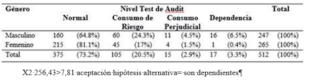 En la población estudiada que declaró ingerir bebidas alcohólicas, las mujeres resultaron prevalecientes en el nivel normal (81.1%), mientras que los varones lo hicieron en aquellos correspondientes a consumo de riesgo (24.3%), consumo perjudicial (4.5%) y dependencia (6.5%); situación que refleja la necesidad de establecer medidas al respecto, sobre todo entre los estudiantes de sexo masculino (tabla 3). En relación con estas variables, el estadístico Chi Cuadrado permitió establecer la existencia de dependencia entre “género” y “nivel de consumo”.