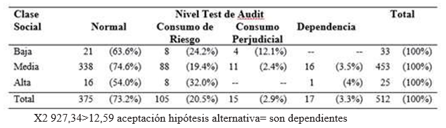 La mayoría de los estudiantes que declararon consumir alcohol pertenecieron a la clase social media (453 de 512 individuos). Los datos indicaron que el consumo de riesgo preponderó en