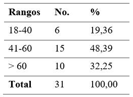 La media de la edad de los pacientes que participaron en el estudio fue de 57 años, un número superior al 90 % de estos tenían más de 40 años. En relación con esa característica, Cruz Peña et al.(16) observaron un resultado similar, solo el 2 % de su población de estudio tuvo menos de 40 años.