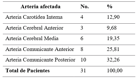 La arteria comunicante posterior resultó la más afectada en los pacientes estudiados (32,26 %); mientras que, la comunicante anterior fue en el 25,81 % de los casos y la cerebral media en el 19,35 % (tabla 2).