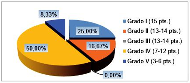 Los investigadores observaron la presencia de compromiso cerebral en el 58,33% de los casos estudiados; entre estos, un 50% resultó moderado y el otro 8,33% fue severo, atendiendo a la escala de coma de Glasgow,(17) además un 50% de los pacientes tenían una HSA moderada, más del 50% de los pacientes también presentó déficit focal de acuerdo a la escala de la WFNS.(18) Al respecto, Sander Connolly et al.(1) establecen que esa ruptura del vaso sanguíneo provoca síntomas de gravedad que generan molestias considerables en los pacientes, entre los que se encuentran: cefalea, disminución del sensorio, síntomas de hipertensión endocraneana, signos meníngeos, crisis convulsivas como sus síntomas capitales, e incluso la muerte.