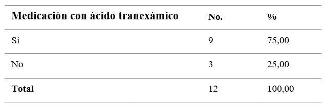 Los datos recopilados indicaron que al 75% de los pacientes que desarrollaron isquemia cerebral tardía, a los que les fue suministrado ácido tranexámico previamente como parte del tratamiento; encontrando una relación significativa entre ambas variables (p=0.008). Con respecto a ese resultado, un estudio de la Neurosurgery Journal(19) reporta un hallazgo similar, por lo que esos autores señalan al uso de ese fármaco como un factor de riesgo para el desarrollo de la complicación asociada descrita. Esos investigadores recomiendan el uso de este antifibronílitico para prevenir el resangrado por un corto período de tiempo, pues puede incrementar el riesgo de ictus isquémico en el paciente.