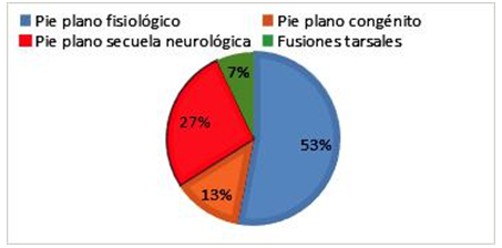 En relación con el tipo de alteración en la bóveda plantar, los investigadores observaron que el 53% de los pacientes pediátricos presentó pie plano fisiológico, el que es propio de la edad debido a la presencia de tejido adiposo en esa región (gráfica 3).