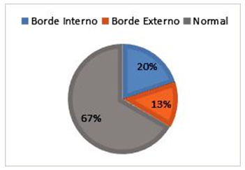 Los documentos revisados reflejaron que los niños y niñas afectados fueron tratados mediante los ejercicios de Risser. La valoración de la evolución de los pacientes, al momento de recoger los datos, reportó una elevación de la cifra de huella plantar normal hasta el 33% (gráfico 4).
