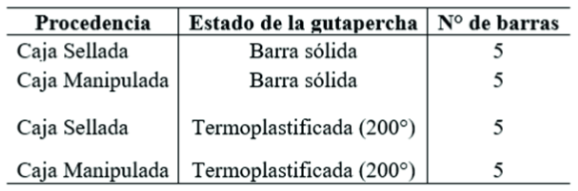Las gutaperchas manipuladas fueron obtenidas de cajas que estuvieron en uso, en un ambiente clínico por un período de 30 días, almacenadas en un cajón (gaveta) donde se guardaron el resto de esos materiales.
