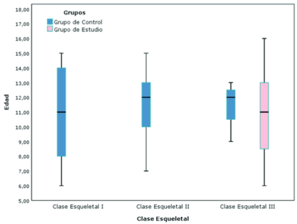 El análisis de la clase esqueletal en el grupo de control posibilitó observar que entre la categoría I prevalecieron los individuos con edades comprendidas 6 a 15 años; entre la II, de 7 a 15 años y en la III, de 9 y 13 años. Para el grupo de casos (100% en clase III), se apreció una mediana 11 años en un rango comprendido entre 6 y 16 años (figura 1).