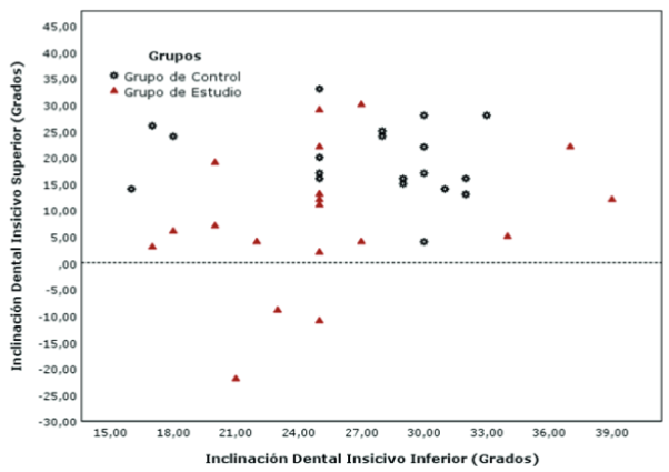 Las pruebas inferenciales aplicadas posibilitaron apreciar que no existieron diferencias estadísticamente significativas en el grado de inclinación del incisivo inferior entre ambos grupos (p=0,249; t=1,17; gl=38); sin embargo, se observó diferencias significativas en relación con el grado de inclinación del incisivo superior entre los dos grupos (p=0,002; t=3,25; gl=38); esa última situación también ocurrió con respecto a la discrepancia ósea (p=0,00; U=9).