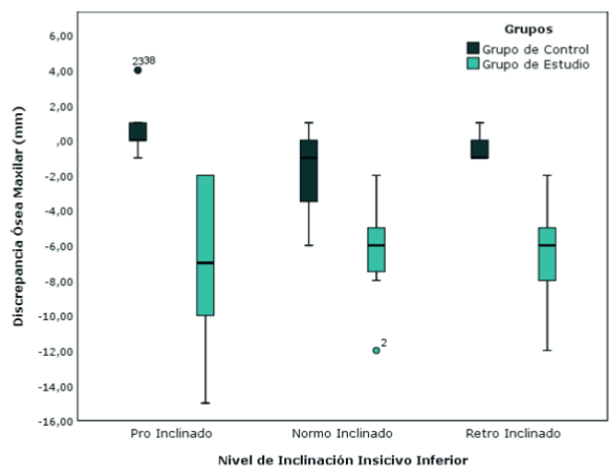 El grupo de control mostró una variabilidad de rangos con presencia de los tres tipos de inclinación dental, con valores desde -1 hasta 4 mm de discrepancia ósea. Sin embargo, en el grupo de casos, la presencia retroinclinación resultó mayoritaria con un rango muy amplio de discrepancia entre -15 y -2 mm, con una mediana de -6 mm. La proinclinación resultó de menor presencia, con una mediana de discrepancia ósea de -7 mm (figura 3).