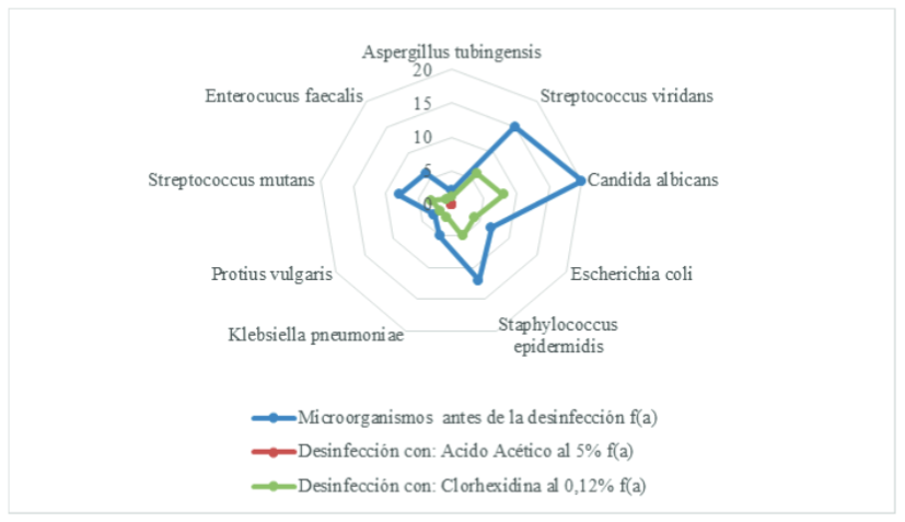La desinfección al utilizar ácido acético al 5% demuestra que tiene un poder desinfectante del 100%; mientras que la clorhexidina al 0,12% siguió mostrando presencia de microorganismos aunque en menor frecuencia, destacando C. albicans , S. viridans (tabla 2).