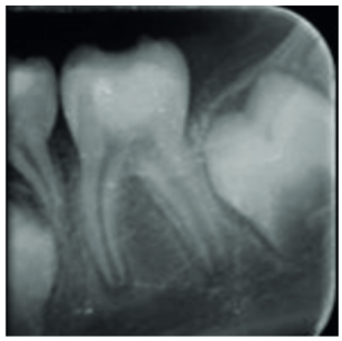 El examen radiográfico refleja una sombra radiolúcida a nivel coronal compatible con impresión diagnóstica de caries oclusal severa, ápices radiculares en estado de nolla 8 (figura 1).