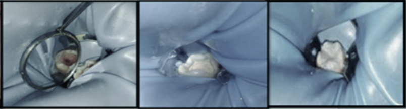 Segunda cita (figura 2), bajo régimen de aislamiento absoluto y administración de anestesia infiltrativa, se retiró la restauración provisional y el tejido afectado por la caries. La remoción en la zona más profunda se realizó con una pieza de alta velocidad y fresa diamantada redonda mediana, luego se usó una cuchareta para retirar la dentina afectada. Durante ese proceso se produjo una exposición pulpar, que requirió de un lavado abundante utilizando solución fisiológica y el secado de las superficies con torundas estériles.