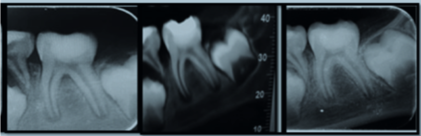 La evolución del paciente se realizó mediante controles clínicos mensuales durante seis meses. Las pruebas de percusión y palpación posibilitaron determinar la ausencia de los signos o síntomas de la patología pulpar, así como de fistulas o inflamación. Las radiografías periapicales (figura 3), tomadas a intervalos de 30 días, mostraron resultados satisfactorios en relación con la formación radicular, el engrosamiento de las paredes radiculares y el cierre apical.