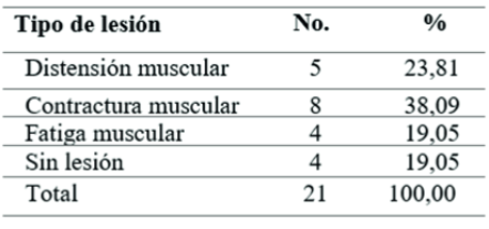 Entre los deportistas incluidos en el estudio prevalecieron aquellos que presentaron lesiones por contracturas musculares, representando un 38,09%; mientras que solo un 19,05% resultó ileso (tabla 1). Teniendo en cuenta los criterios de Bonino et al.,(11) esa situación pudiera estar relacionada con un déficit de la flexibilidad isquiotibial.