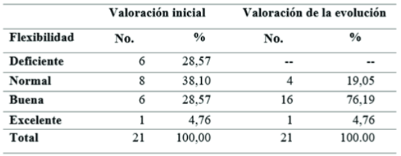 Los datos relativos a la flexibilidad permitieron establecer la existencia de un aumento de la flexibilidad en el 95,24% de los futbolistas participantes en el estudio, siendo importante desatacar que más del 75% de estos concluyeron con una evaluación al respecto de buena (tabla 4).