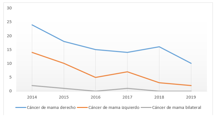 Tras el análisis minucioso de los últimos cinco años de la estadística de la Unidad Oncológica de Solca Chimborazo, se obtuvieron resultados que indican que el cáncer de mama en los últimos años va disminuyendo considerablemente, entre el 2014 aparecen 40 personas con este diagnóstico incluso es el año que presenta 2 casos de cáncer bilateral, para el año 2019 las cifras han disminuido a 12 pacientes féminas con cáncer de mama.