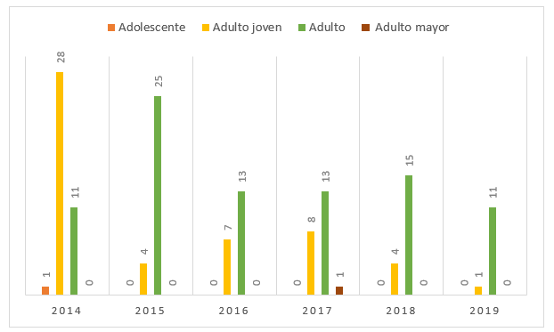Los resultados relativos a la edad arrojaron que en 2014 existía un predominio de los pacientes adultos jóvenes; sin embargo, a partir de 2015 esa característica se desplazó hacia los adultos con edades comprendidas entre 36 y 65 años. Al respecto, Shoemaker et al. observaron que la mayoría de casos de cáncer de seno analizados por ellos se presentó en el grupo etario de adulto, con un porcentaje de 77,3.(10)